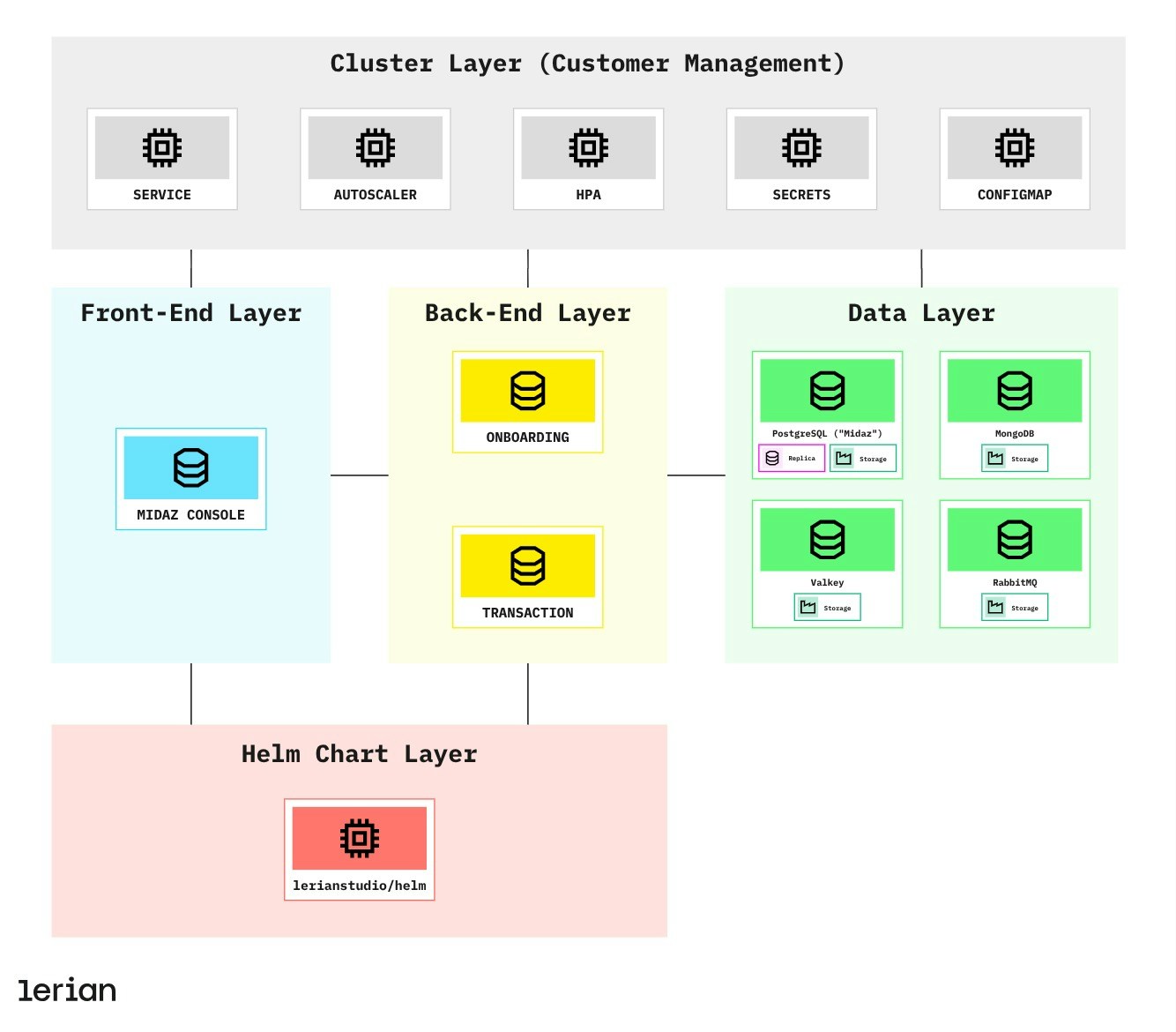 This layer includes the databases and infrastructure components required to support application data and event flows:- PostgreSQL (named “Midaz”): Used as the leading relational database; includes a replica for redundancy or read scaling.