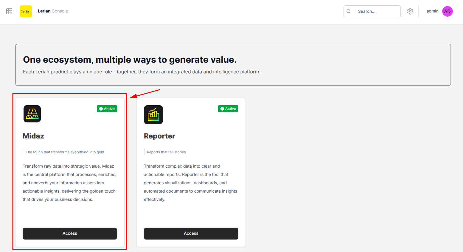 - Unified platform: Access Midaz alongside other Lerian products (Reporter, etc.) from a single interface