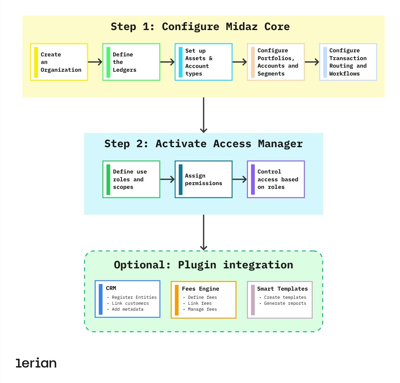 This guide is for Enterprise Model users with access to Midaz and Access Manager. You’ll also see how to integrate optional plugins — Fees Engine, CRM, and Smart Templates — in the most effective order.