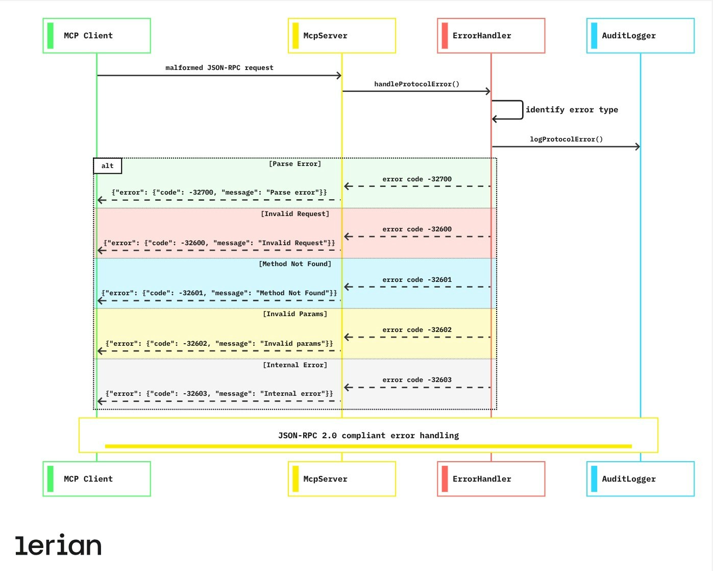 If something goes wrong (e.g., a malformed tool call, an unexpected backend response, or a missing configuration), the MCP server gracefully returns a standardized error. In many cases, the assistant can recover and retry with improved input or fallback logic. The following diagram shows how Lerian MCP detects, handles, and communicates protocol-level errors.