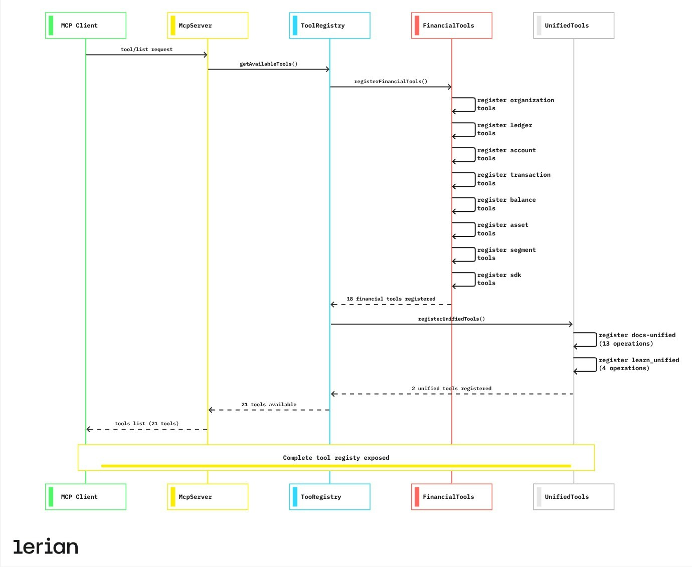 The following diagram shows how Lerian MCP announces tools to your assistant and makes them usable within the client.