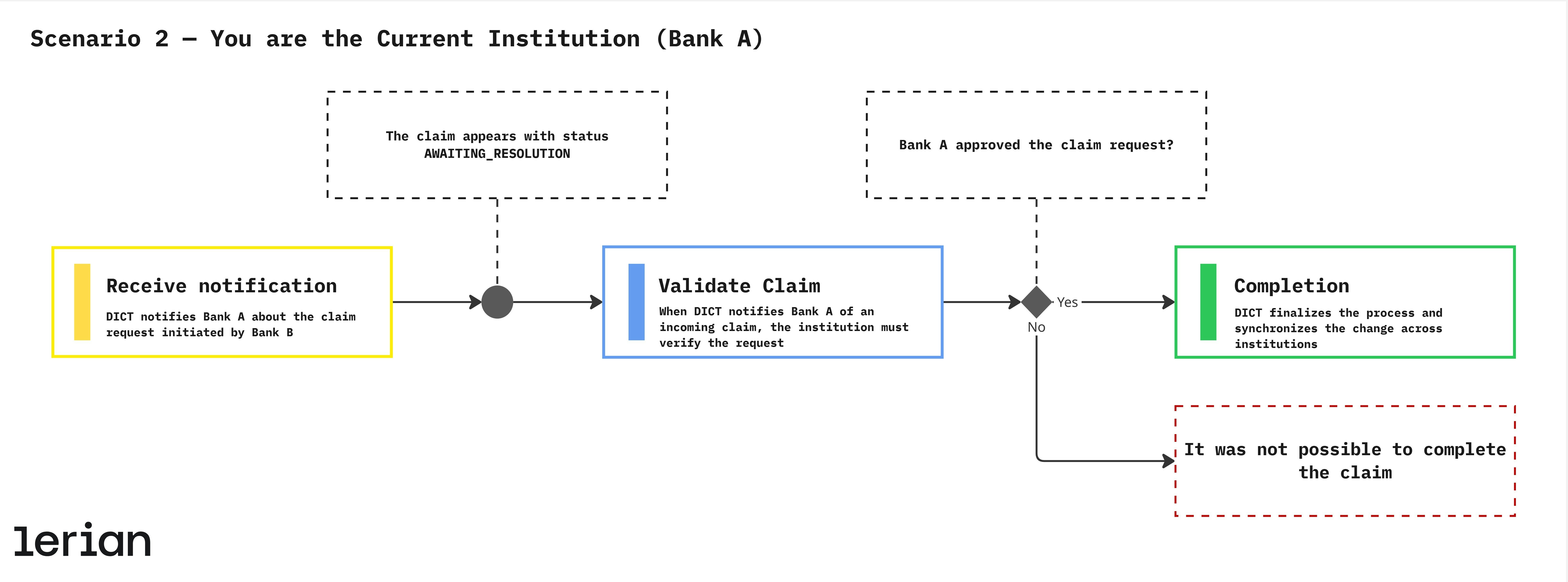 In this scenario, the customer belongs to Bank A (you), which currently holds the key being requested by another institution. Bank A must validate the claim request (Portability ou Ownership) received from DICT. 1. Receive notification DICT notifies Bank A about the claim request initiated by Bank B. The claim appears with status AWAITING_RESOLUTION. 2. Validate Claim When DICT notifies Bank A of an incoming claim, the institution must verify the request. Depending on the claim type, this step may require customer confirmation or document review. Result:- If approved → DICT transfers the key to Bank B.