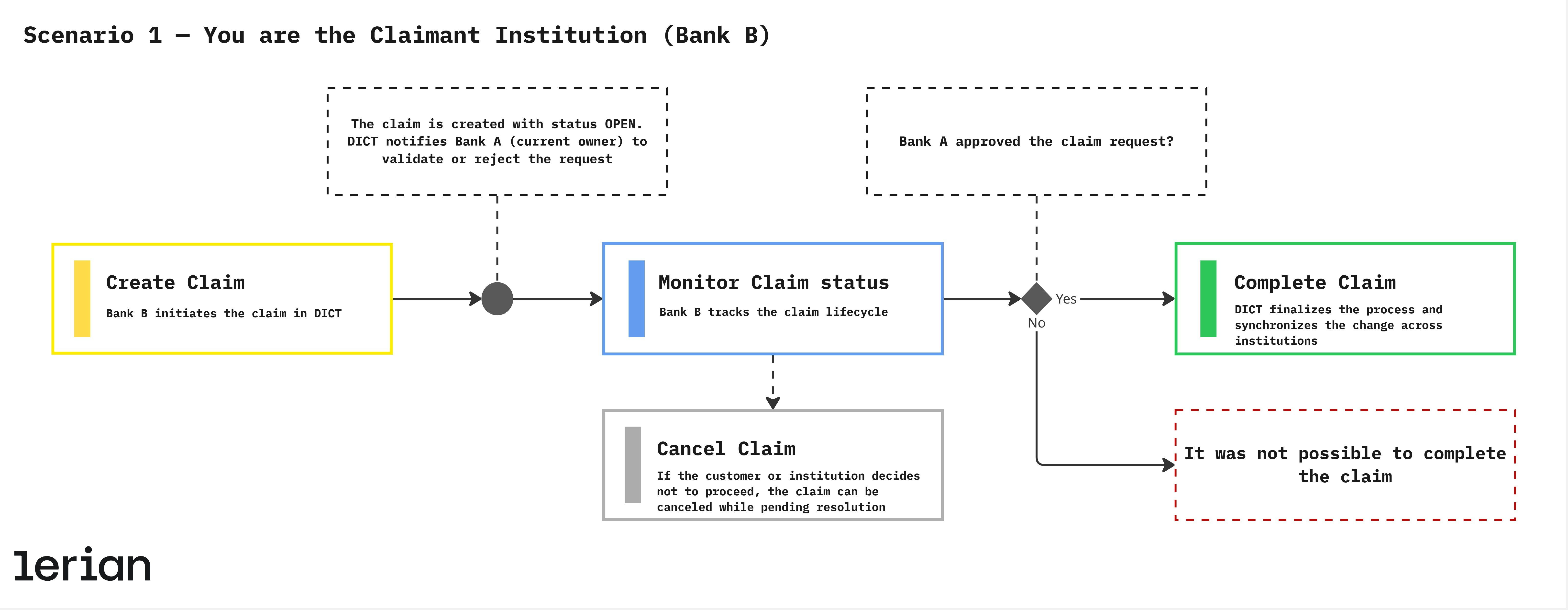 In this case, the customer belongs to Bank B (you), which will receive the key. Bank B is responsible for creating, tracking, and (if necessary) canceling the claim. 1. Create Claim The customer requests a Pix key change — either transferring it from another institution or correcting its ownership. Bank B initiates the claim in DICT. Result:- The claim is created with status OPEN.