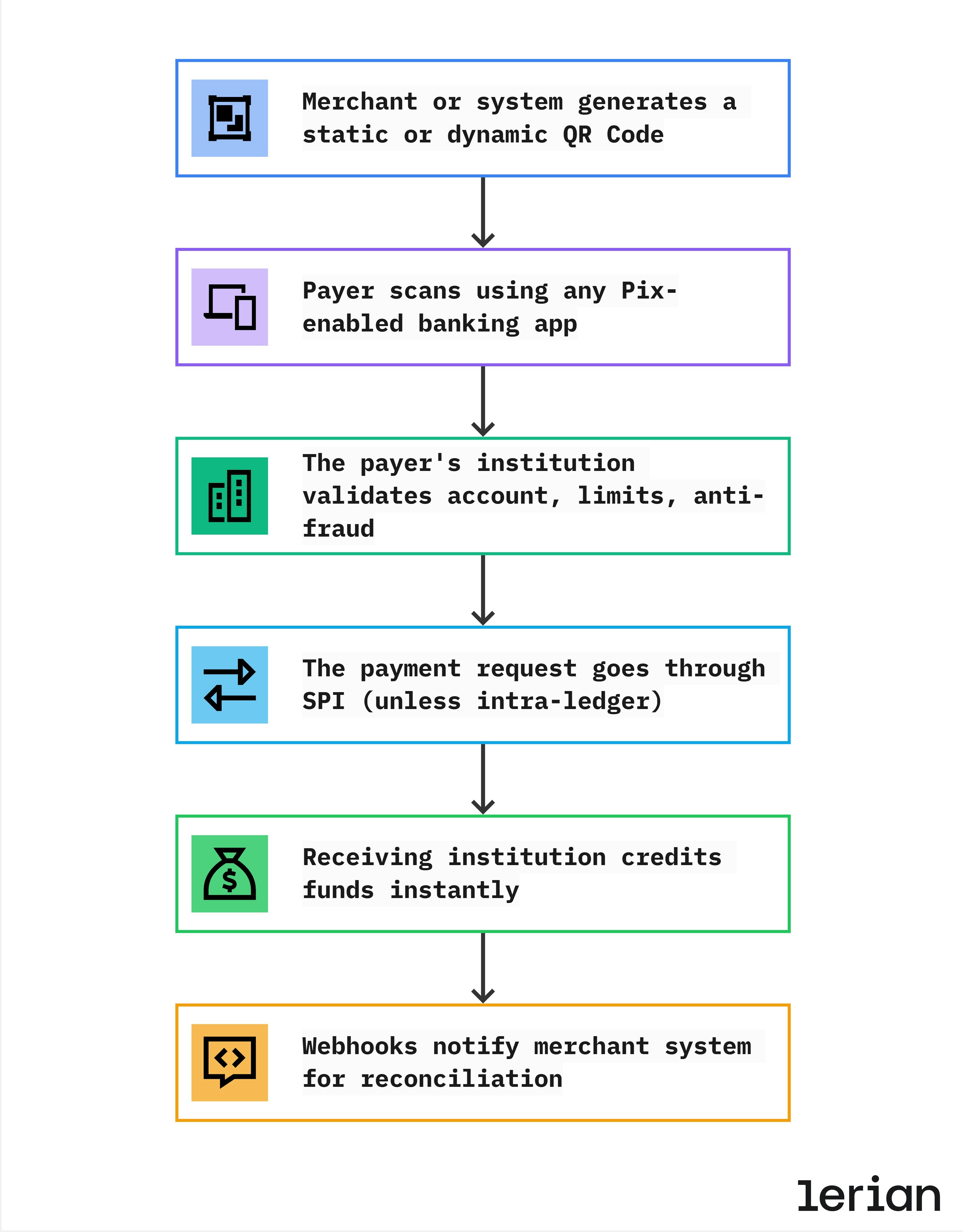 - The payment follows the standard Pix processing flow: validation → SPI → credit.