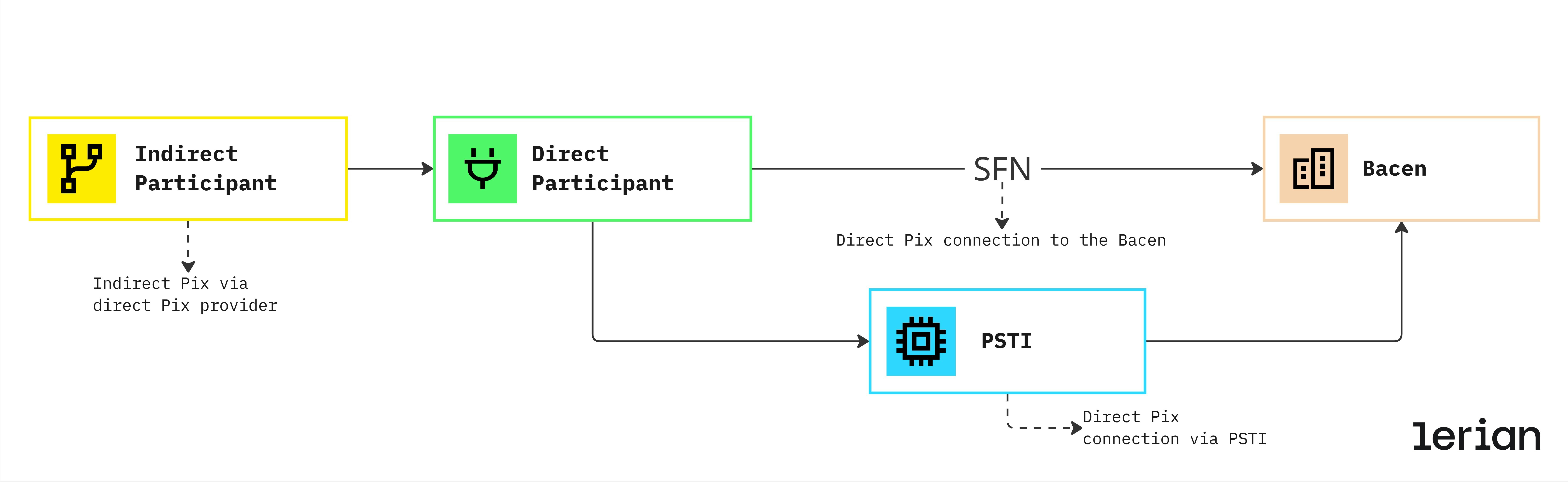 You connect to Pix via a Direct Participant’s infrastructure. Ideal when the institution does not maintain SPI/DICT connectivity.Direct Pix (via PSTI + Gateway)