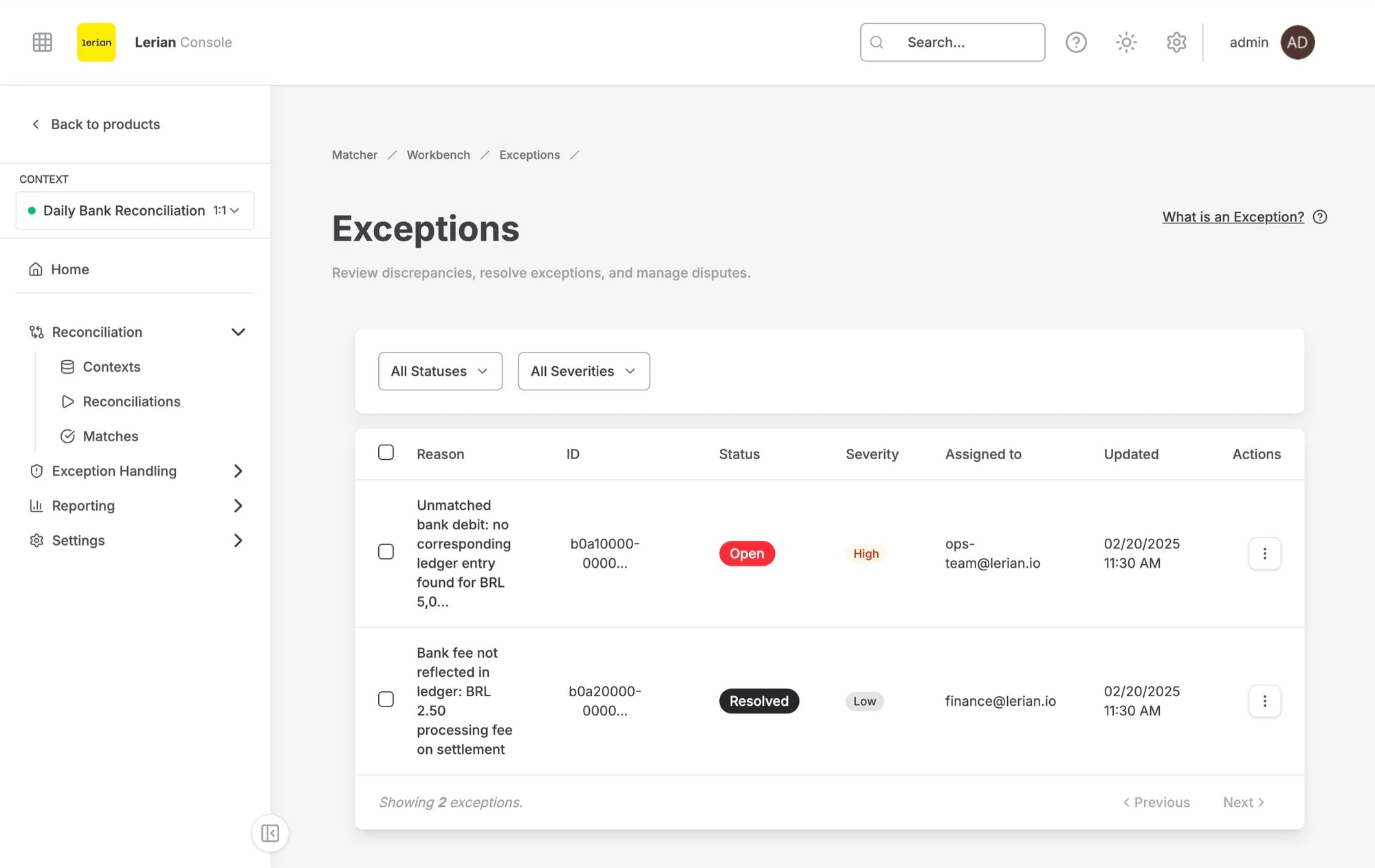 | Assigned to | The person responsible for resolving the exception |