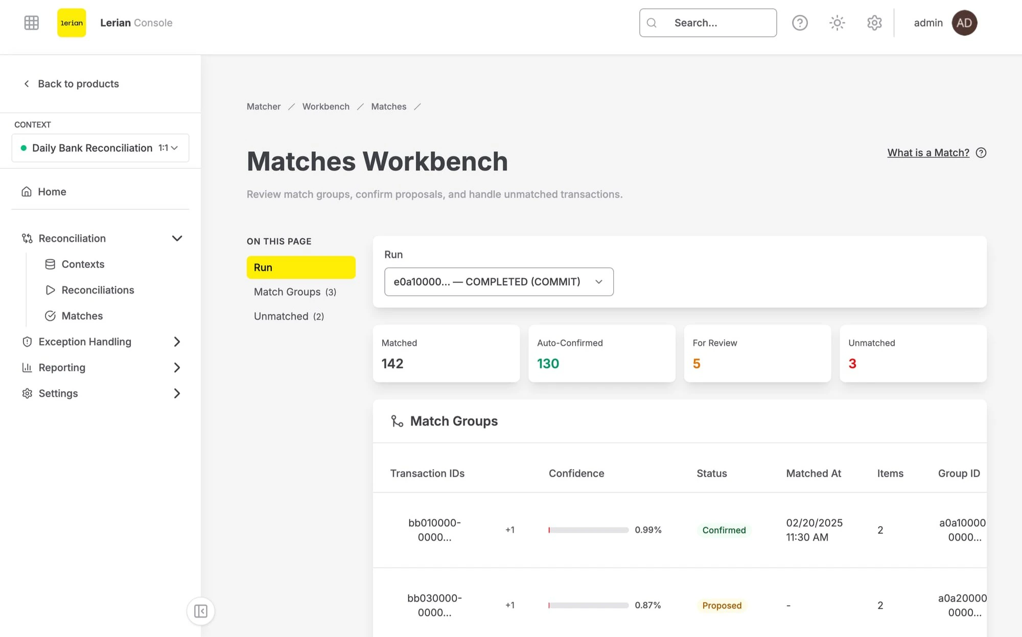 If a match was made incorrectly, you can unmatch it. Both transactions return to the unmatched pool and become available for re-matching or manual exception resolution.