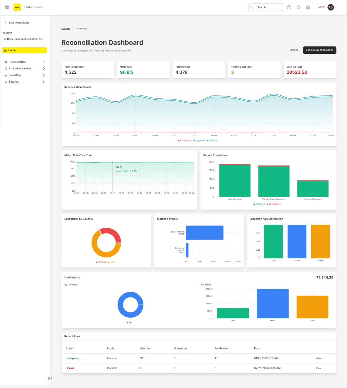 | Cash Exposure | Aggregate monetary value of unmatched transactions flagged as critical. Highlighted in red. |