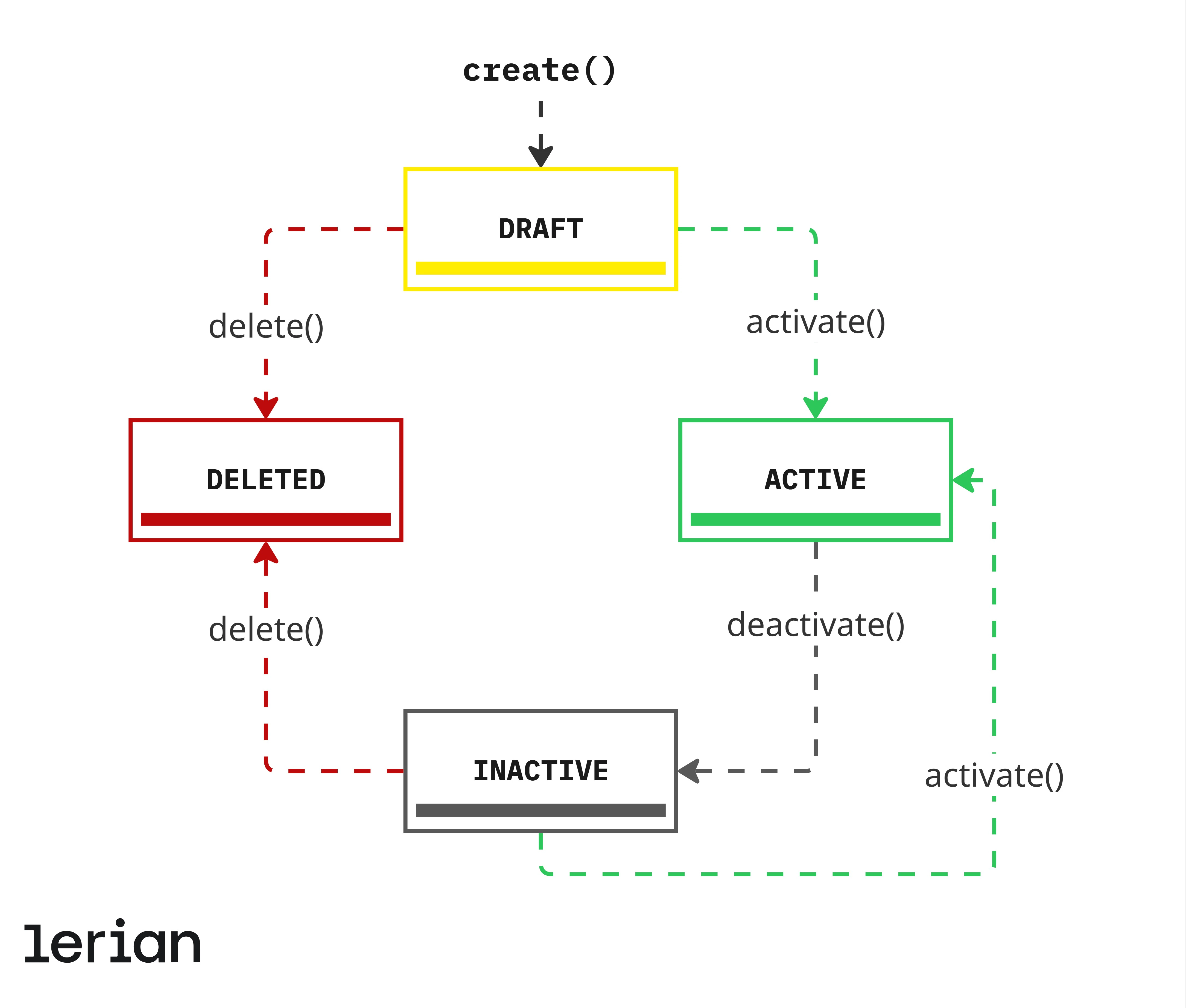 delete | DRAFT, INACTIVE | DELETED | Permanent removal (cannot delete ACTIVE rules) |