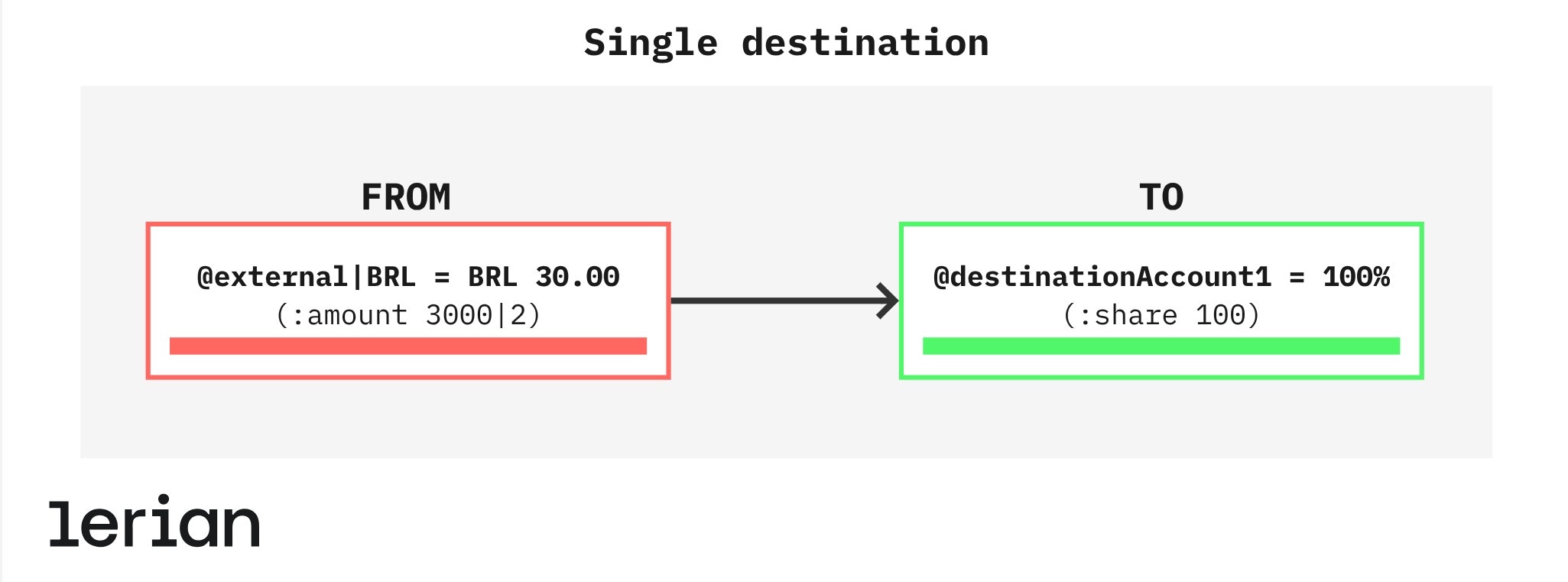 In multi-destination transactions, the transaction amount is divided among multiple destination accounts. Values can be distributed by shares, fixed amounts, or remaining balance.Example