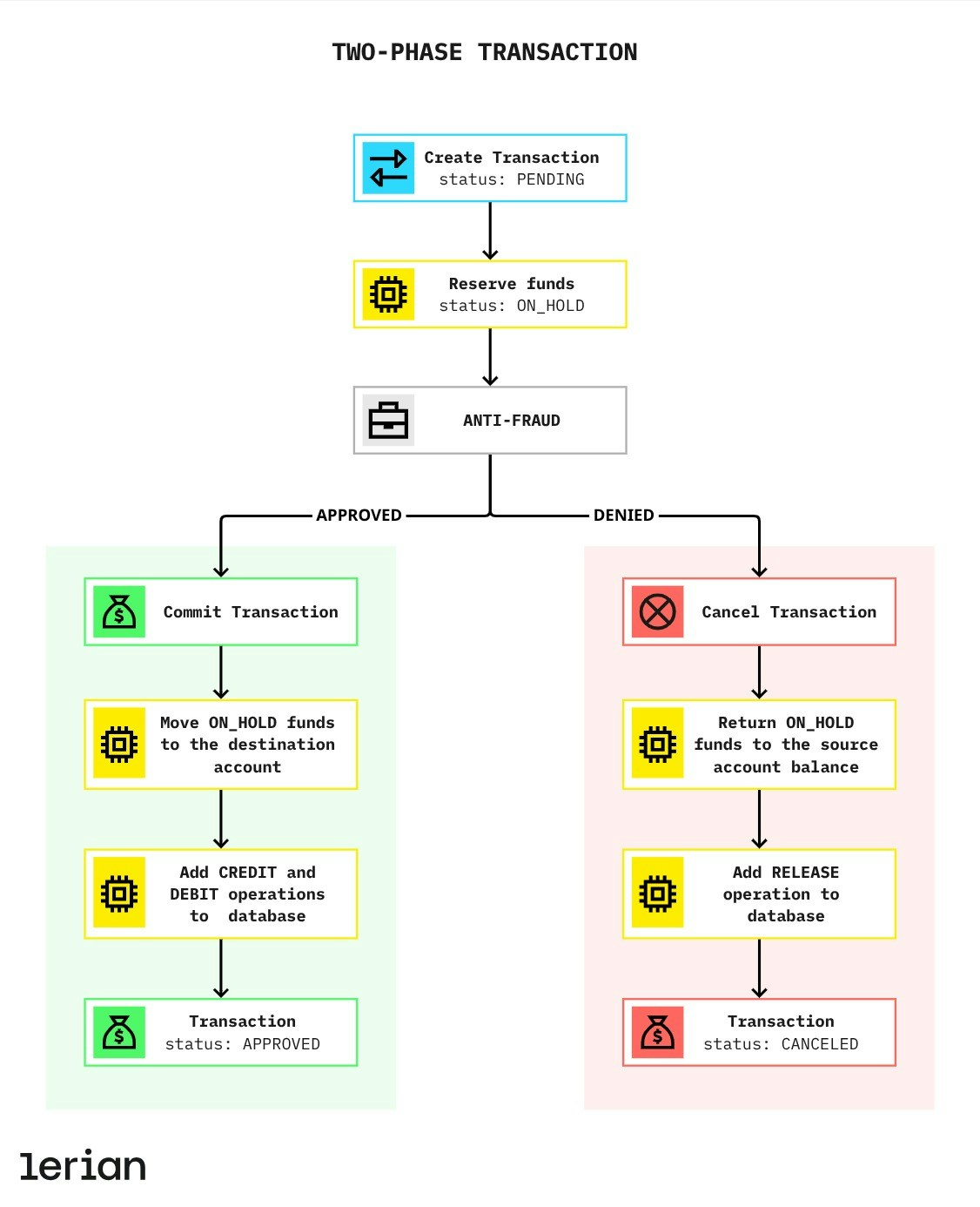 - Commit: Finalizes the transaction. Funds move from on_hold to the destination balance, and debit/credit operations are recorded.