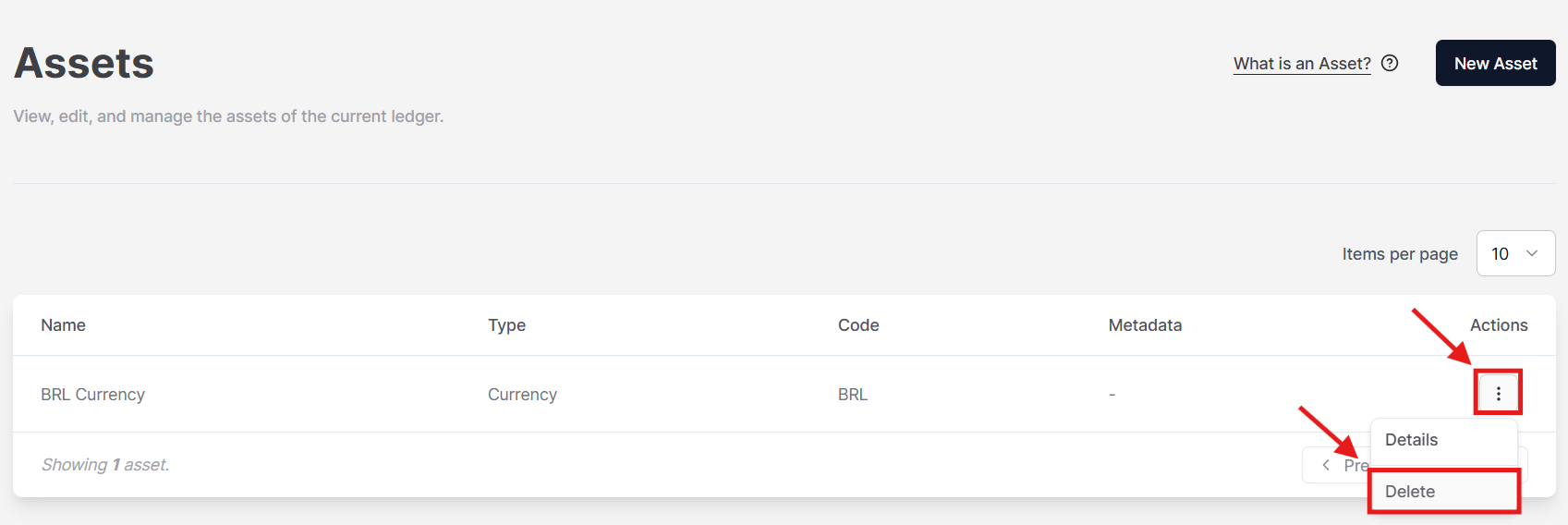 From the Assets page, find the Asset that you want to delete, click the three dots () from the Actions column, and select Delete (figure 1).