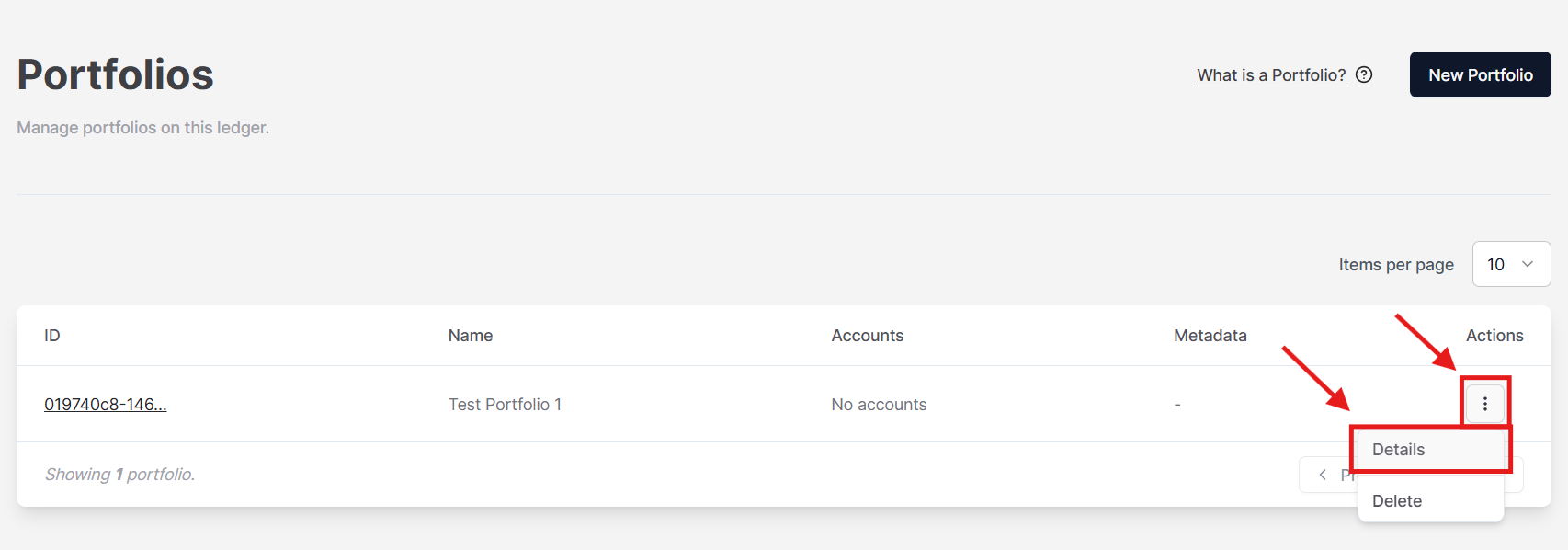 From the Portfolio page, find the Portfolio that you want to edit, click the three dots () from the Actions column, and select Details (figure 1).