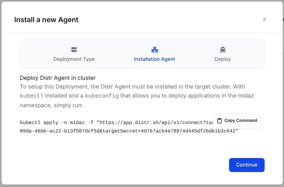 After selecting the agent type, the following screen shows a customkubectl command for your deployment (Figure 3).