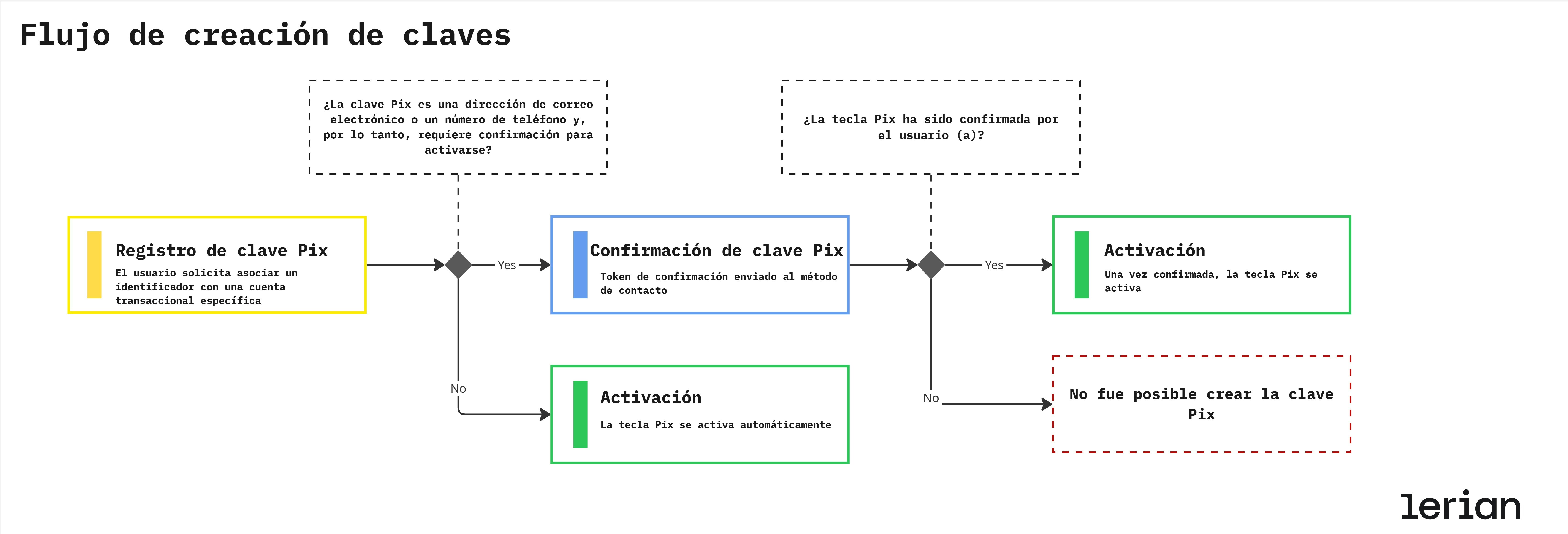 Una clave Pix se registra cuando un usuario o institución solicita asociar un identificador (como CPF, correo electrónico, número de teléfono o clave aleatoria) con una cuenta transaccional específica. En esta etapa, la clave se crea en un estado pendiente, esperando validación según su tipo.2. Confirmación
