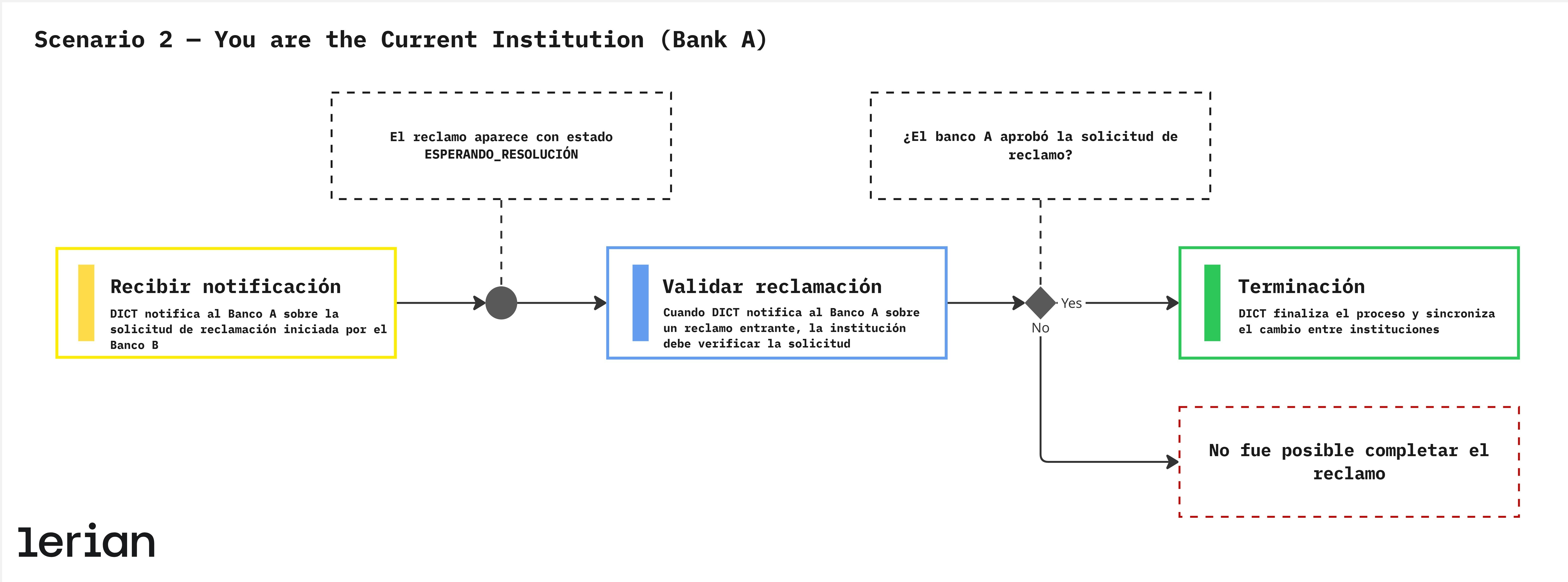 En este escenario, el cliente pertenece al Banco A (usted), que actualmente posee la clave que está siendo solicitada por otra institución. El Banco A debe validar la solicitud de reclamo (Portabilidad u Propiedad) recibida de DICT. 1. Recibir notificación DICT notifica al Banco A sobre la solicitud de reclamo iniciada por el Banco B. El reclamo aparece con estado AWAITING_RESOLUTION. 2. Validar Reclamo Cuando DICT notifica al Banco A de un reclamo entrante, la institución debe verificar la solicitud. Dependiendo del tipo de reclamo, este paso puede requerir confirmación del cliente o revisión de documentos. Resultado:- Si se aprueba → DICT transfiere la clave al Banco B.