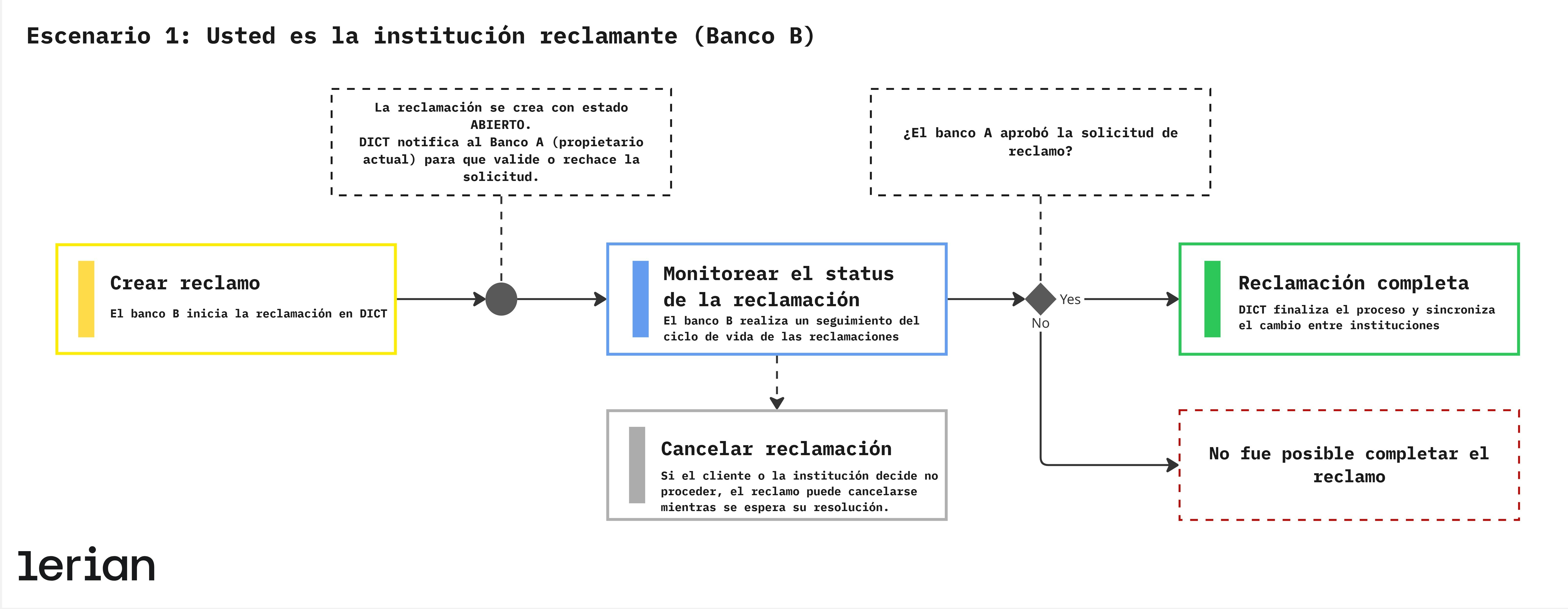 En este caso, el cliente pertenece al Banco B (usted), que recibirá la clave. El Banco B es responsable de crear, rastrear y (si es necesario) cancelar el reclamo. 1. Crear Reclamo El cliente solicita un cambio de clave Pix — ya sea transfiriéndola de otra institución o corrigiendo su propiedad. El Banco B inicia el reclamo en DICT. Resultado:- El reclamo se crea con estado OPEN.