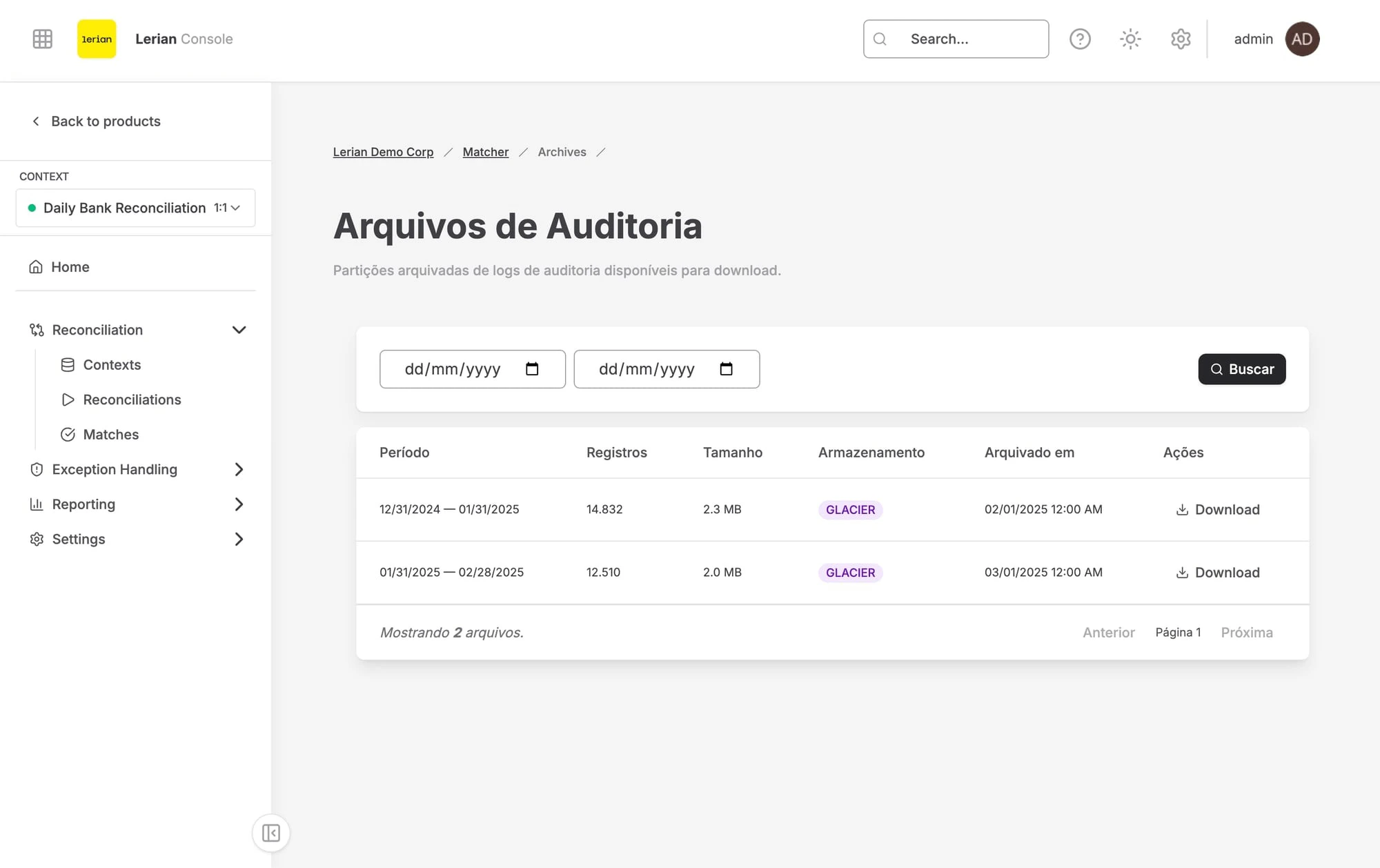 Navega a Matcher → Reporting → Archives en la barra lateral izquierda.