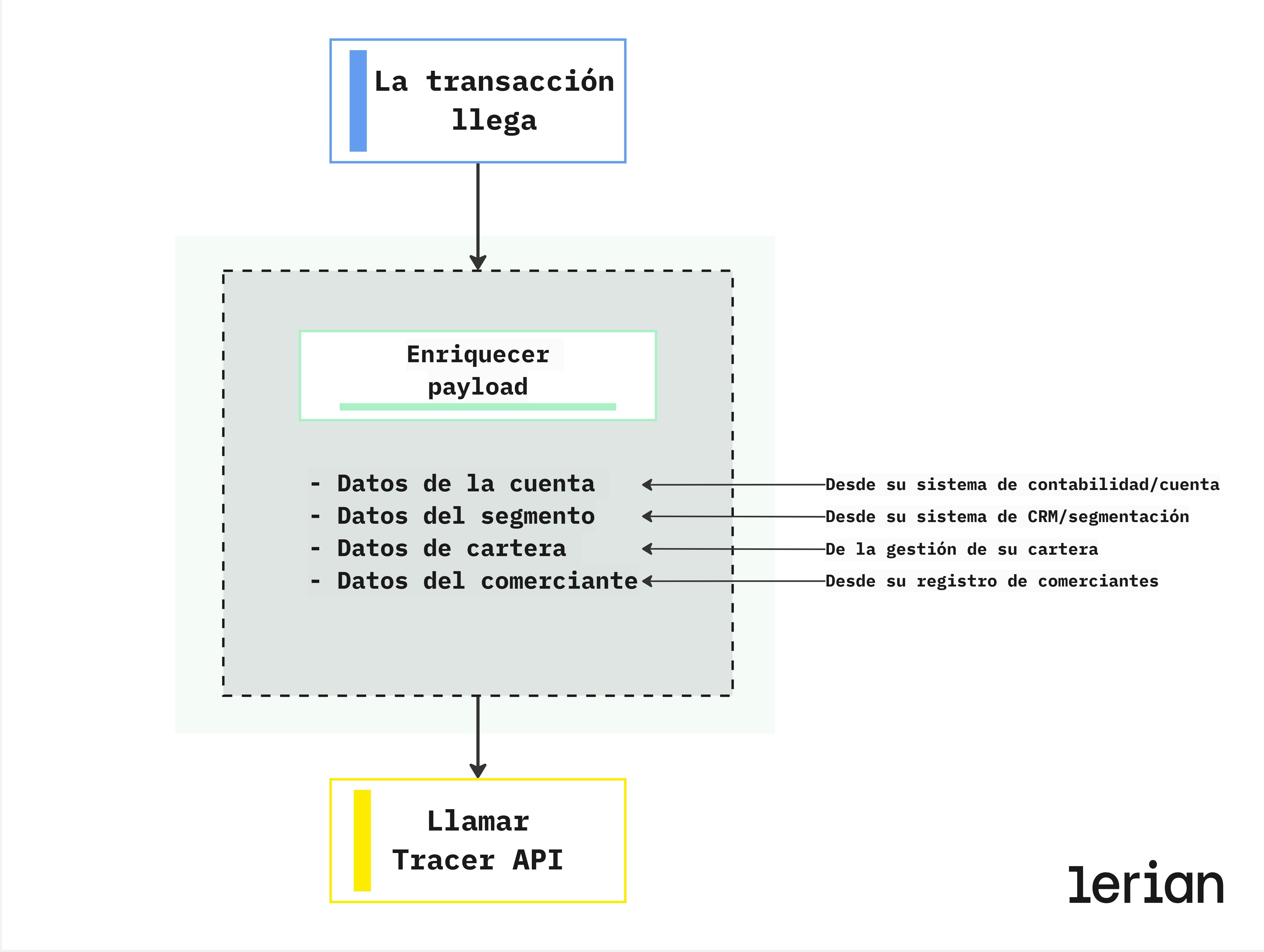 Como sistema integrador, eres responsable de:- Enriquecer el payload con datos de cuenta, segmento, portafolio y comercio antes de llamar a Tracer