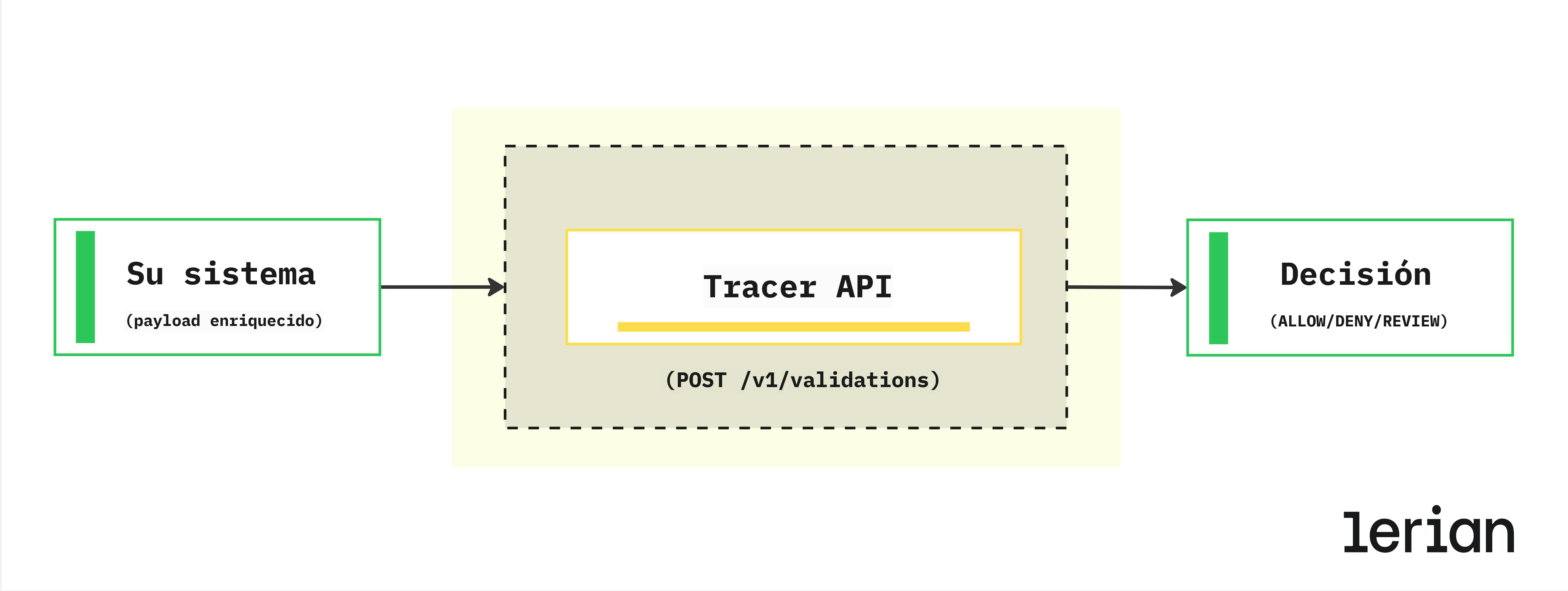 Tracer esta disenado para ser llamado por sistemas de autorizacion (pasarelas de pago, orquestadores de flujo de trabajo o procesadores de transacciones) que necesitan decisiones de validacion en tiempo real. La integracion sigue un patron simple de solicitud-respuesta: