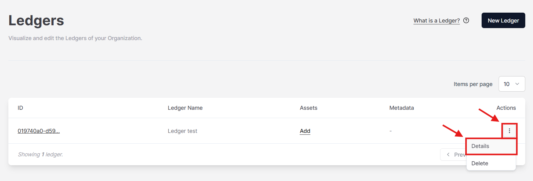 En la página Ledgers, localiza el Ledger que deseas ver o actualizar. Haz clic en los tres puntos () en la columna Actions y selecciona Details (Figura 1).