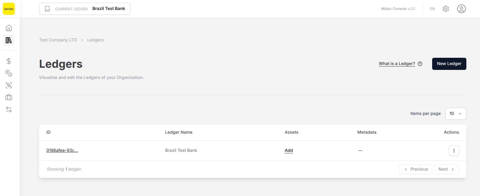 Para ayudarte a mantenerte orientado, la barra superior en Midaz Console ahora incluye una sección que muestra el Ledger en el que estás trabajando actualmente (Figura 1). Este indicador siempre está visible, por lo que nunca perderás el rastro de dónde estás.