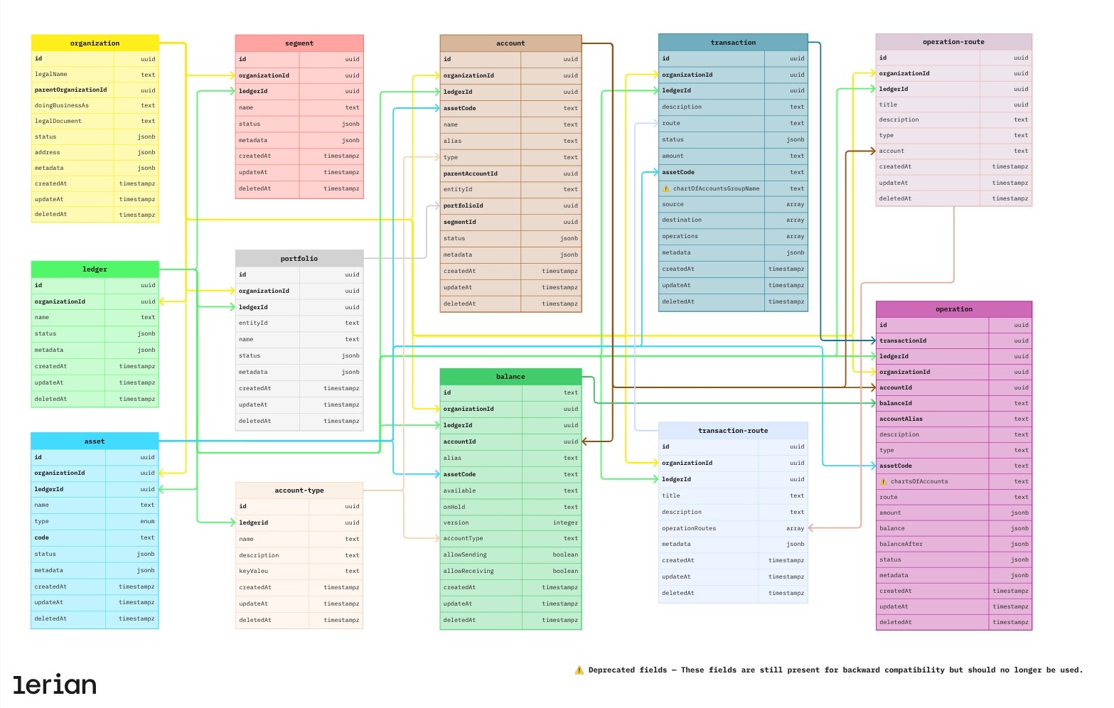 Cada tabela é estruturada para suportar consultas eficientes e integridade de dados, alinhada com o compromisso do Midaz com escalabilidade e flexibilidade.