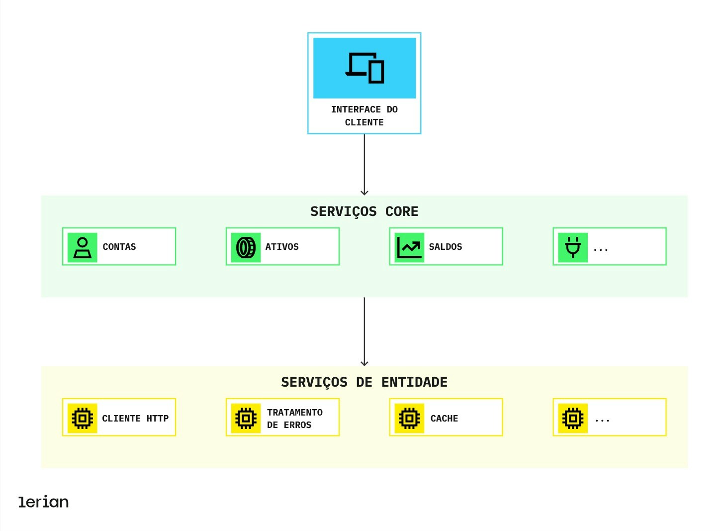 - Camada de Core Services: Esses utilitários fundamentais são usados por todos os entity services. Eles lidam com requisições HTTP, validação de input, processamento de erros, observabilidade, configuração e caching.