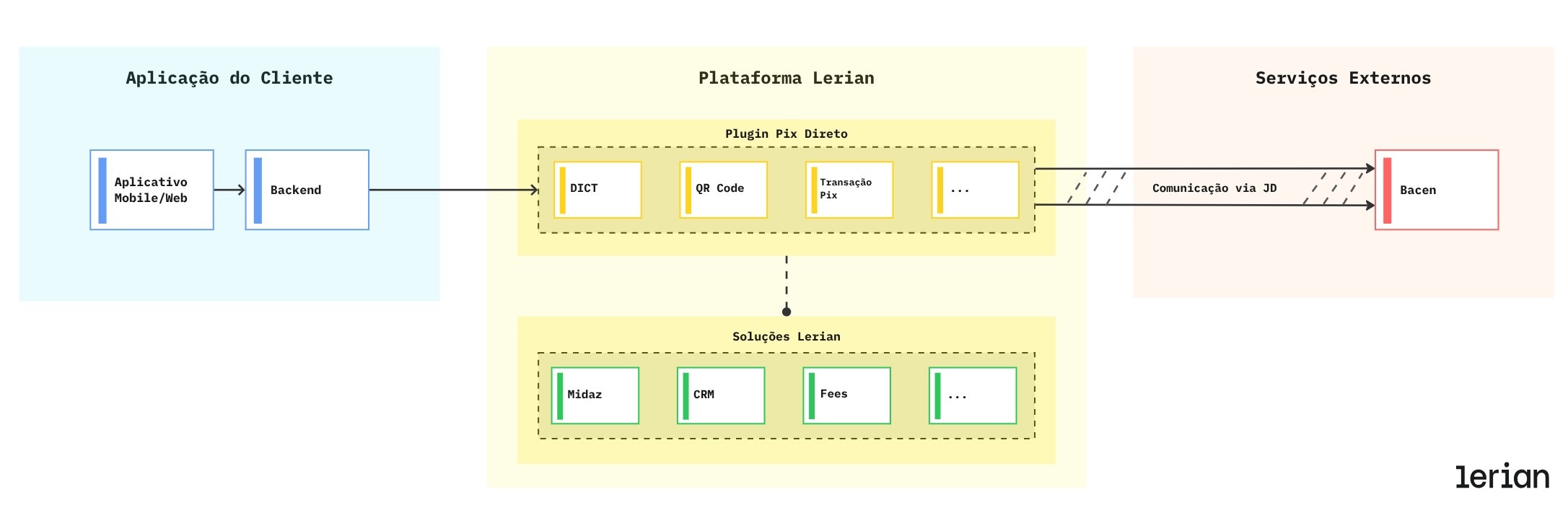 O Plugin Pix Direto fornece uma camada unificada de processamento que abstrai a complexidade da conectividade direta do Pix. Ele se integra nativamente com a JD (um PSTI), gerenciando todas as interações com SPI e DICT em nome da sua instituição. O plugin gerencia: