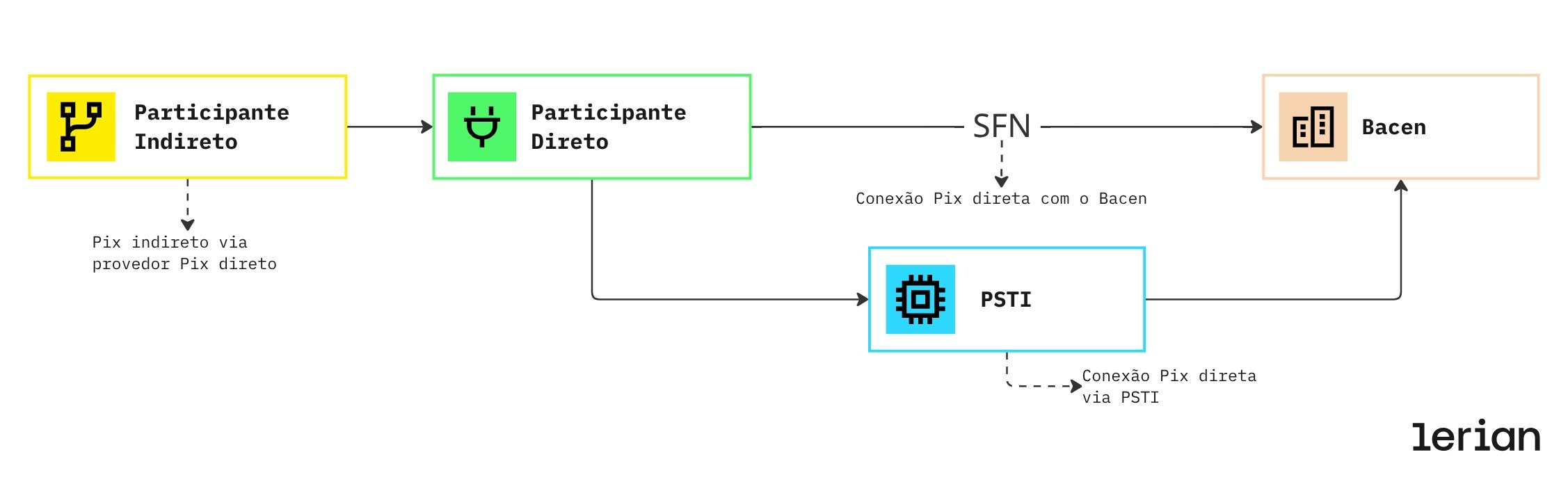 Você opera o Pix diretamente, mas depende de um PSTI certificado + gateway SPI/DICT para comunicação com a rede do BACEN. Este modelo combina autonomia com conectividade regulada terceirizada.Pix Direto (completo)