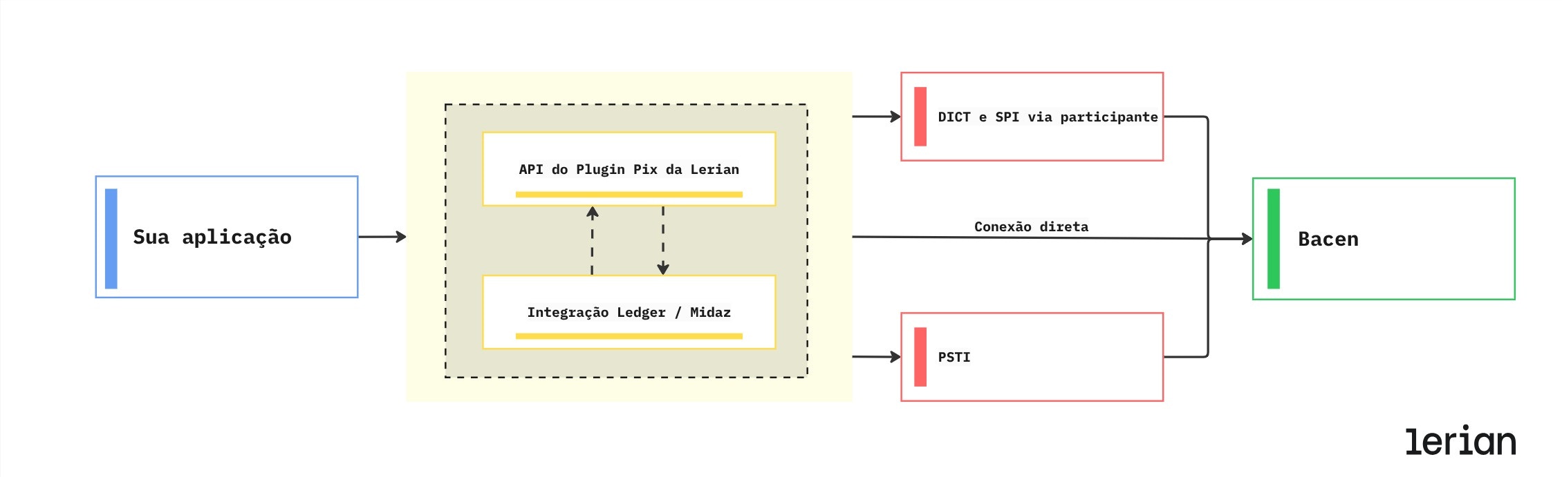 Em todos os modelos de conexão, o plugin atua como o motor Pix dentro da sua infraestrutura: