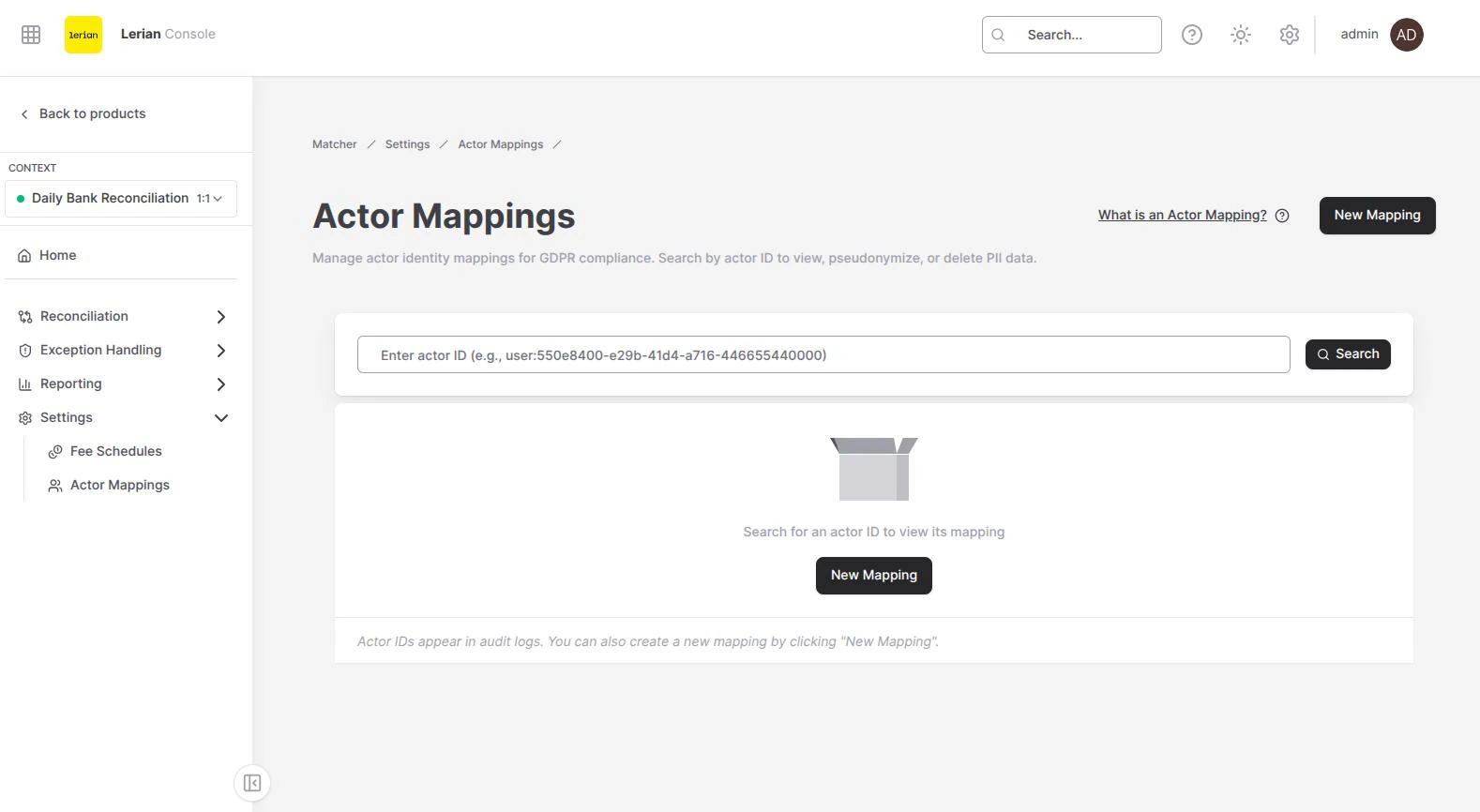 Um informativo expansível “What is an Actor Mapping?” está disponível no topo da página, explicando que um mapeamento de ator associa um ID de ator opaco com PII legível para suportar a conformidade com o GDPR.