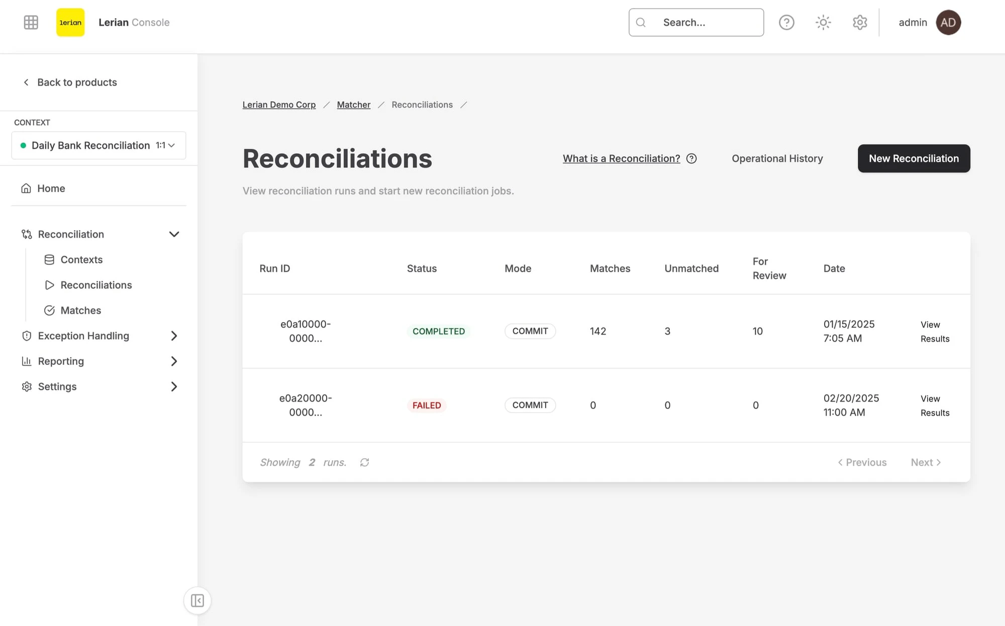 Navegue até Matcher → Operations → Reconciliações na barra lateral esquerda.