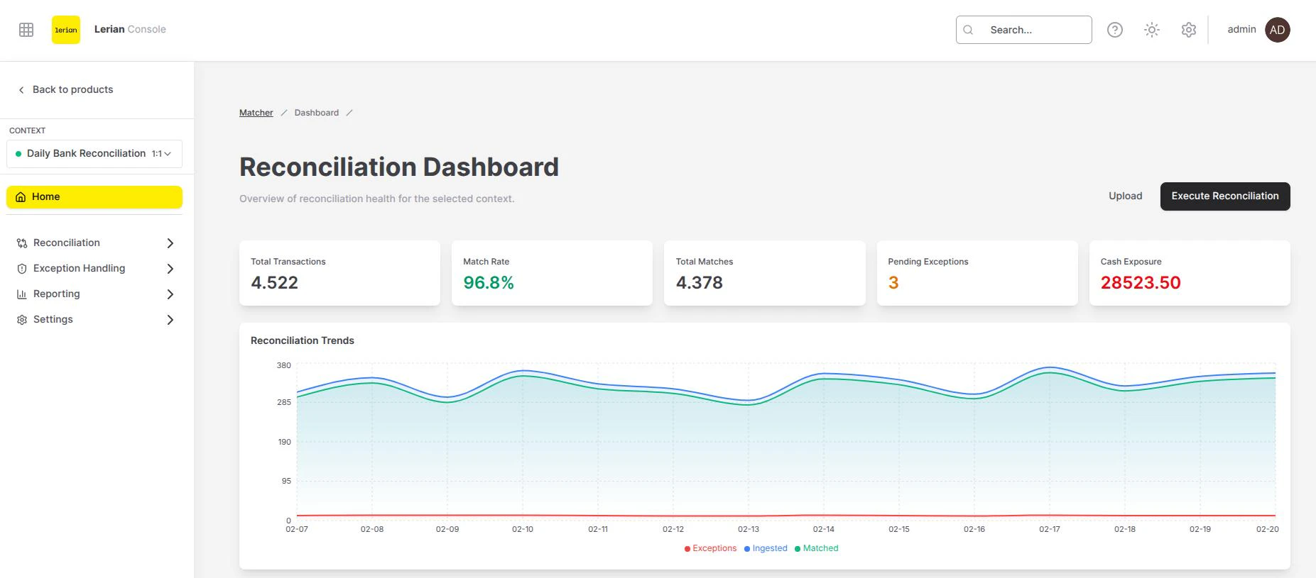 - Executar reconciliação — inicia uma nova execução de reconciliação para o contexto ativo.