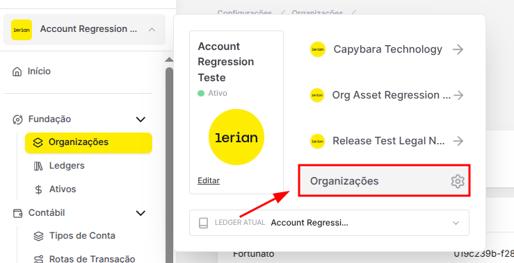 Para abrir a página de Organizations, clique na opção Organizations na seção Foundation do menu lateral esquerdo. A página de Organizations exibe uma lista de todas as Organizations criadas, fornecendo uma visão centralizada para gerenciamento.