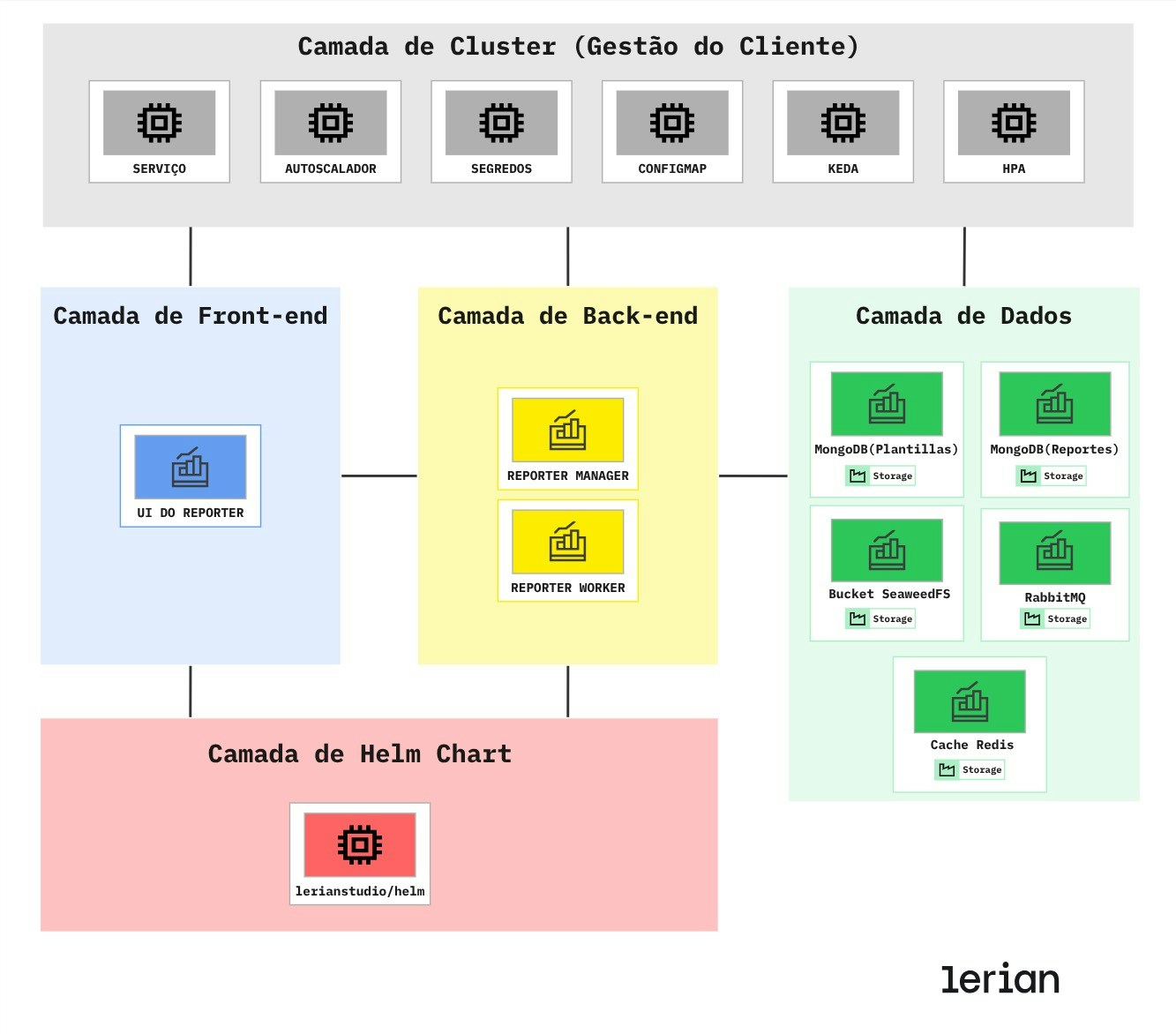 O Reporter é construído sobre uma arquitetura em camadas que mantém as responsabilidades bem definidas e permite crescimento:- Camada de dados: Conecta-se aos bancos de dados por meio de fontes de dados configuradas. Suporta PostgreSQL e MongoDB, com consultas multi-schema para PostgreSQL.
