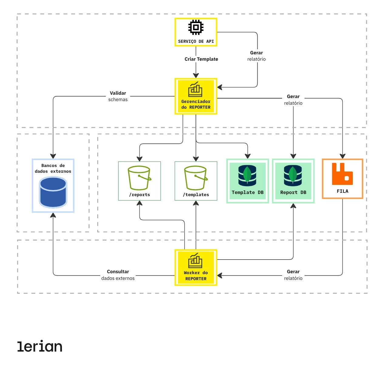 - O Reporter recupera os dados dos bancos de dados configurados (PostgreSQL, MongoDB)
